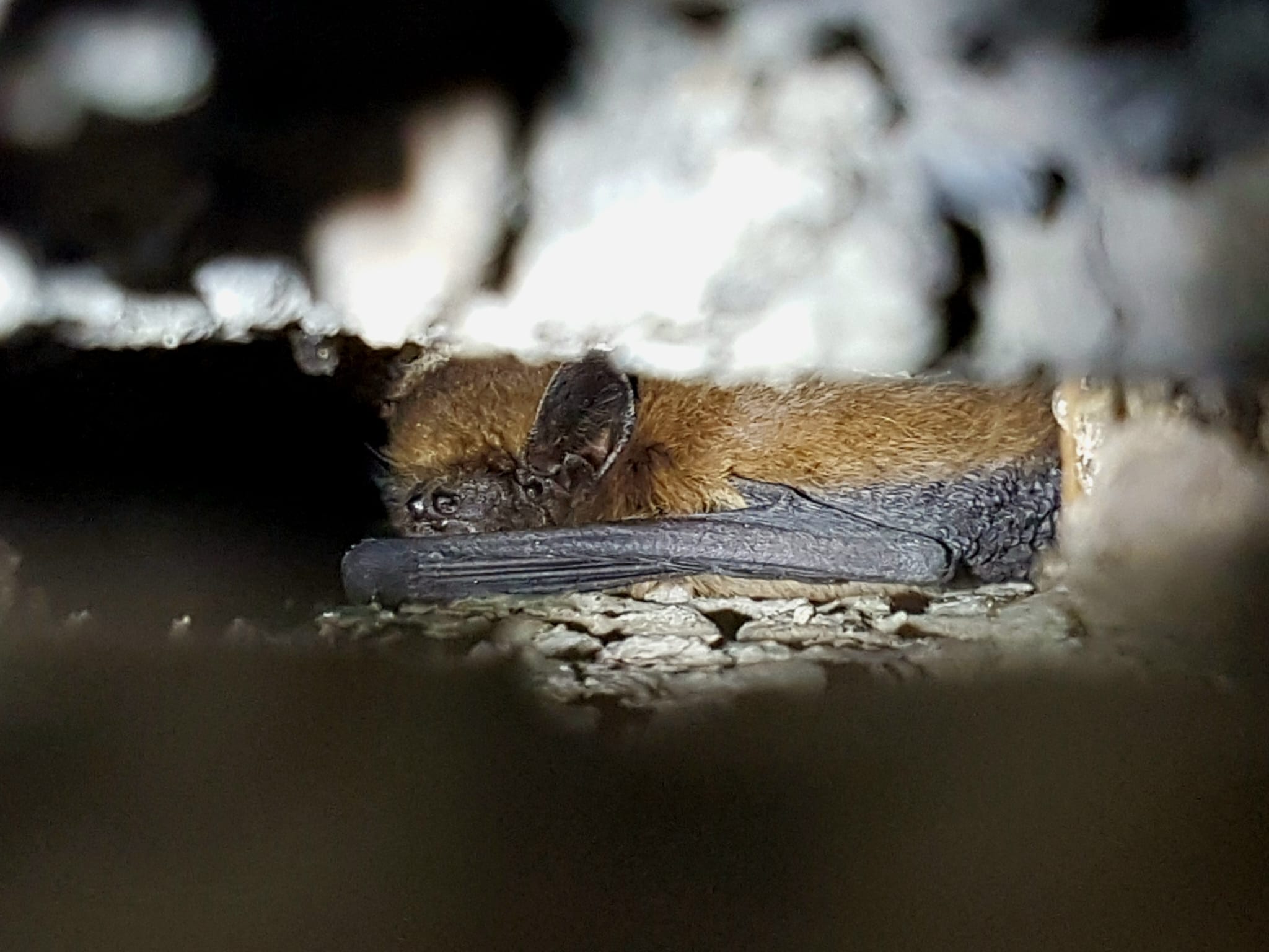 Für manche Projekte, in denen Gebäude im Winter abgerissen oder saniert werden müssen, werden derzeit noch Untersuchungen für Fledermäuse durchgeführt - hier zum Beispiel wurde ein Graues Langohr hängend in einer Stallung beobachtet und ausnahmsweise in Weiß angestrahlt, um es sicher zu identifizieren.