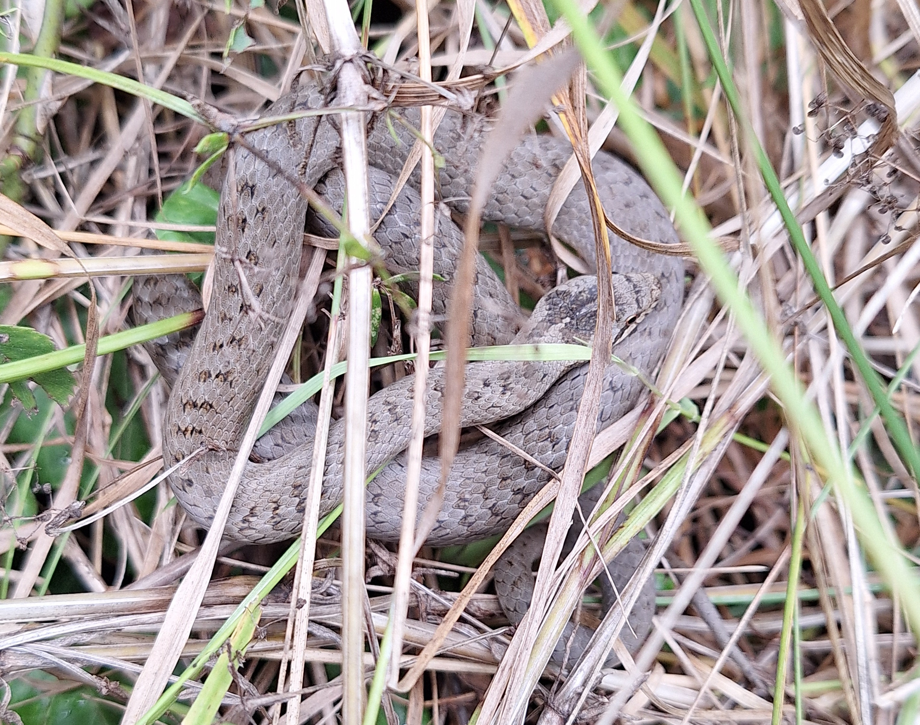 Immer wieder erfreulich, wenn man sie findet: Eine Schlingnatter. Zur Erfassung sind günstige Witterungsverhältnisse (bewölkter Himmel, nasses/schwüles Wetter) und das Absuchen geschützter, ungestörter Stellen nötig. Auch künstliche Verstecke sollten zum Einsatz kommen. Die Schlingnatter verlässt sich gerne auf ihre Tarnung und flüchtet nicht, daher muss man immer sehr aufpassen, wo man hintritt.